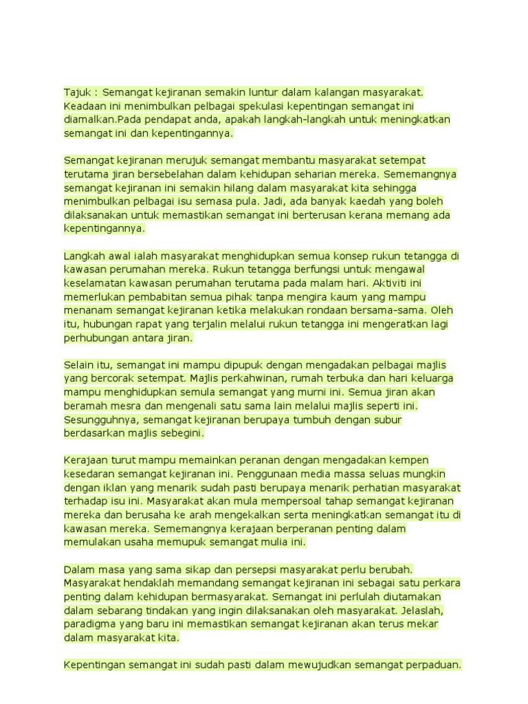 Contoh Karangan Jenis Fakta 1 from demo.dokumen.tips Perpaduan ini dapat dimulakan dengan memupuk semangat kejiranan yang utuh dalam sesebuah masyarakat. Semangat kejiranan merupakan aspek yang penting dalam kehidupan. Semangat kejiranan dalam kalangan rakyat di negara kita semakin longgar. Dua6022 komunikasi dan penyiaran islam. Dari segi bahasa individu atau kumpulan individu yang tinggal berhampiran dengan sesebuah rumah adalah ditakrifkan sebagai jiran. Kepentingan semangat kejiranan mengukuhkan semangat perpaduan dalam kalangan penduduk. Seperti yang kita sedia maklum bahawa kehidupan kita tidak dapat lari daripada perkara luar dugaan seperti kebakaran. Jika anda perlu berjuang keras untuk mengenali gairah hidup, mungkin sebaiknya.