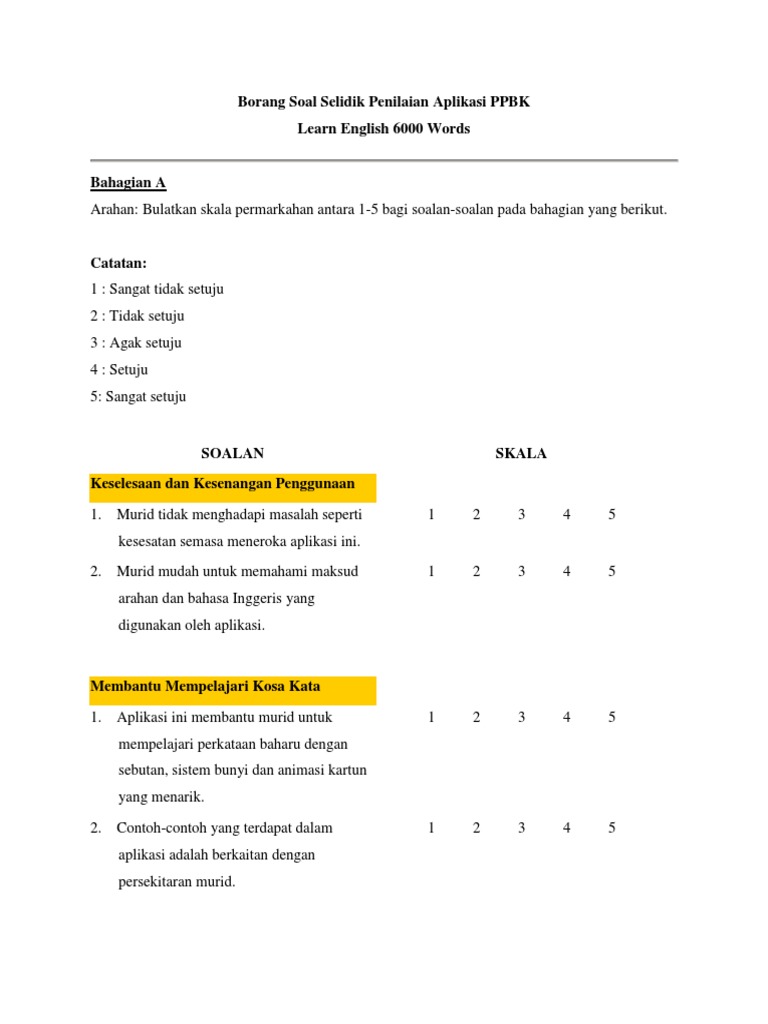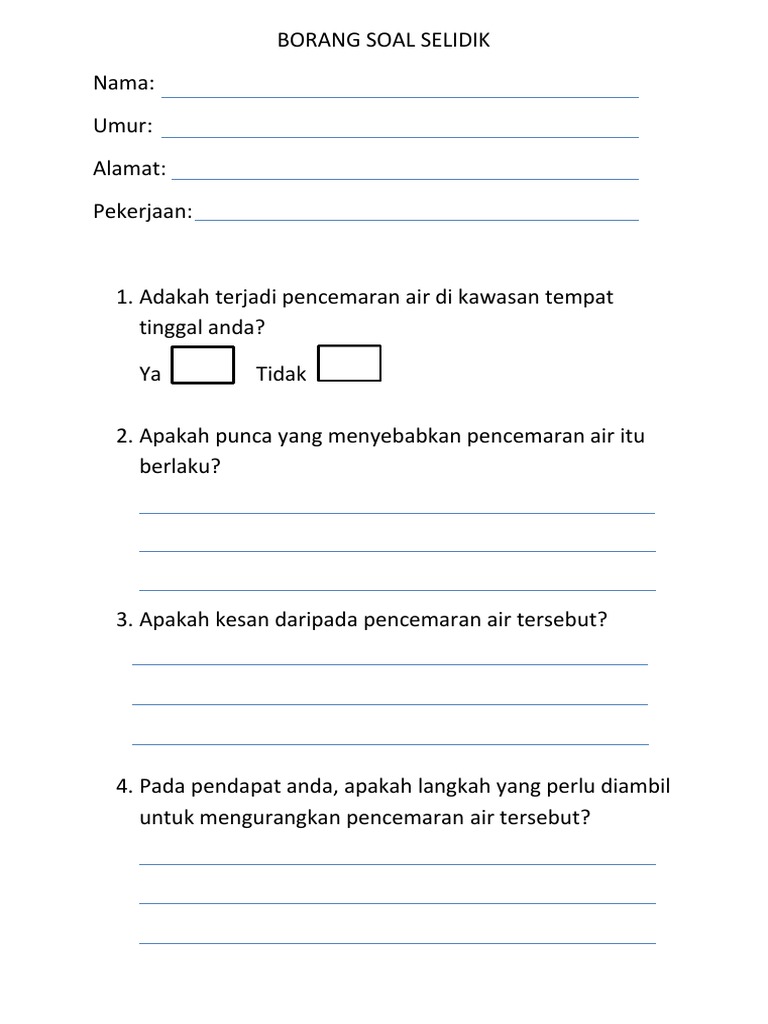 Contoh Borang Soal Selidik Kajian Pengajian Am from imgv2-2-f.scribdassets.com Contextual translation of maksud kaedah soal selidik into english. Langkah umum bagi analisa data dari borang soal selidik dimulakan dengan mengenalpasti variabel dan seterusnya menfokuskan kaedah pengiraan compute yang. Individu yang membina borang soal selidik. Dalam skala likert 5 mata, setiap mata diberi skor; Di mana ia merupakan sebahagian daripada mekanisme kajian dan tugasan geografi pt3 pada tahun ini. Dalam penyelidikan penggunaan borang soal selidik adalah satu kaedah saintifik yang penting dalam membuat pengumpulan data. Borang soal selidik tajuk : Borang soal selidik geografi pt3 2017.