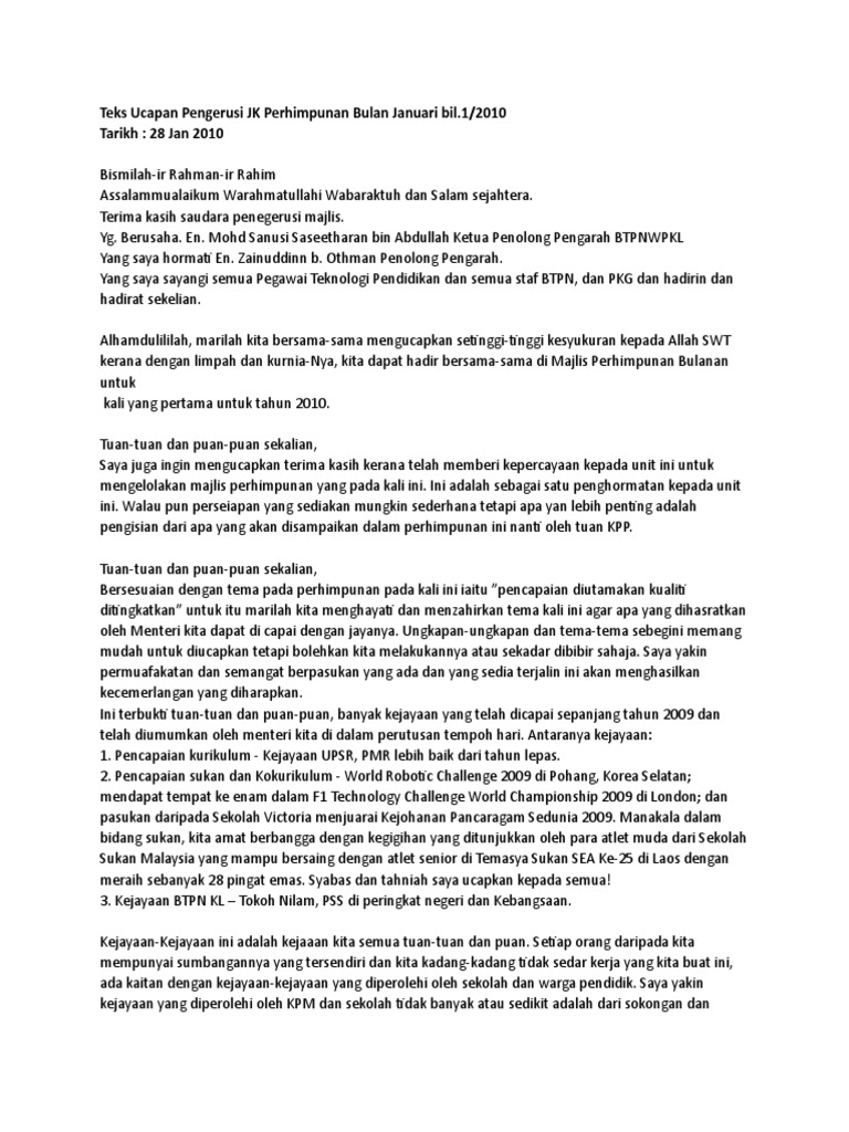 Teks Ucapan Perhimpunan Bulanan - Teks ucapan ketua pengarah planmalaysia sempena program executive talk planmalaysia bersama pengurusan tertinggi kementerian perumahan dan kerajaan tempatan (kpkt).. 27 downloads 492 views 173kb size. Perhimpunan bulanan jabatan alam sekitar bil. Ucapan perasmian yb dato sri rohani binti abdul karim menteri pembangunan wanita keluarga dan masyarakat. Amanahsesungguhnya majlis ini amat bermakna dengan kehadiran hadirin dan hadirat. Teks ucapan perasmian penutup bulan bahasa 2015 mp3 & mp4.